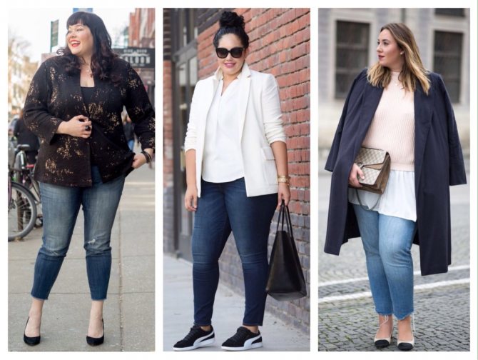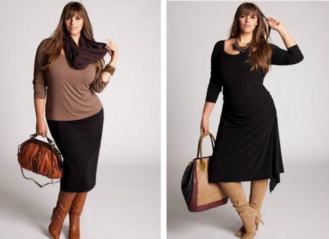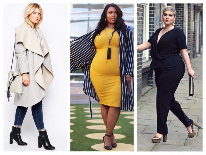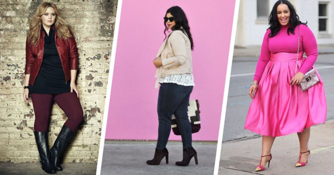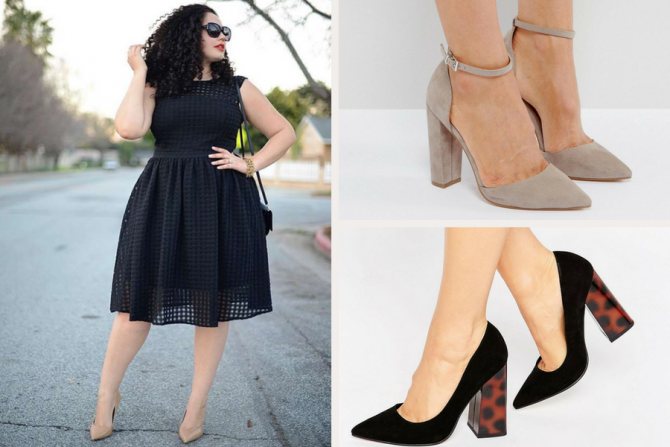 В челси эластичная резинка придаст большего комфорта при ходьбе. Оксфорды визуально сужают ступни, а в милитари-ботинках плавности линий тела будет добавлено немного брутальной четкости, что сделает образ гармоничным. Советуем избегать шпилек или киттен-хилл (каблука-рюмочки), так как эти виды каблука делают походку неустойчивой. Сравнительно крупные очертания тела будут казаться еще больше на фоне утонченных тонких каблуков.